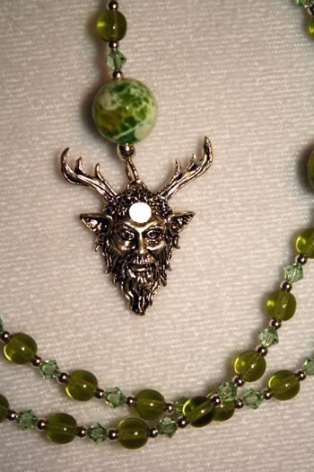 This rosary represents the strength and focus of the God of the Forest and should be used to help focus on the strength inherent within yourself. It is made with 6mm Malachite beads, emerald green Swarovski Crystals and sterling silver spacer beads, with 8mm Malachite “Pater” beads embraced with sterling silver bead caps and a connector depicting the forest flora. The 1 ¼ inch pendant is sterling silver.
