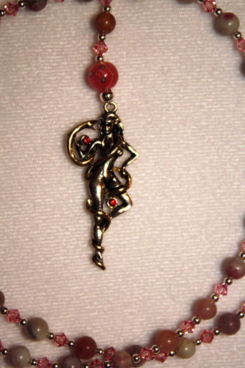One of the ancients of the Upanishads, Daena was a guiding spirit who met you at the end of your life and accompanied you to your “just reward”. Those who seek Her wisdom now are requesting guidance on their path during their life so that they may find peace and fulfillment at life’s end. This rosary is made from 6mm Pink Tourmaline beads with pink Czech glass lampwork beads as the “Maters”, and rose-colored Swarovski crystals and sterling silver spacer beads. The 1 ¾ inch pendant features the skyclad Daena, in silver-colored pewter, entwined with a gold-plated serpent, and two ruby crystal accents.