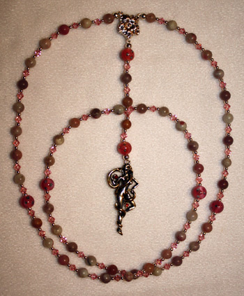 Not truly a “Goddess,” the Chalice Seeker represents the spirit within us which is always searching for the correct and most healing, spiritual path. It’s made with 6mm Rhodonite beads, separated by rose-colored 4mm Swarovski Crystals and 2mm silver spacer beads. The “Mater” beads are dyed pink agate, and the connector is a Celtic Knot. The heavy 1 ½ inch pendant is pewter with gold-colored stylings and both ruby and clear-colored Swarovski Crystal highlights.