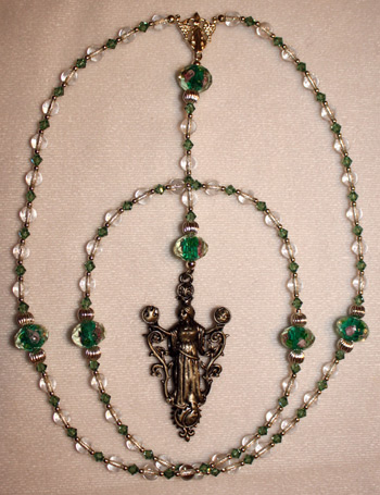 This rosary is available pre-made in Peridot-colored Czech Glass beads and acid-bathed agate “Pater” beads with a Celtic Knot connector for $75.00.