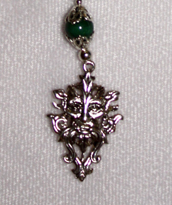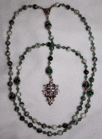 Also a God of the Forest, this rosary represents the power of regeneration and growth. It is made with 6mm Tree Agate, green Swarovski Crystals and sterling silver spacer beads, with 8mm Malachite “Pater” beads bracketed with sterling silver bead caps and a floral connector. The 1 ¼ Green Man pendant is sterling silver.