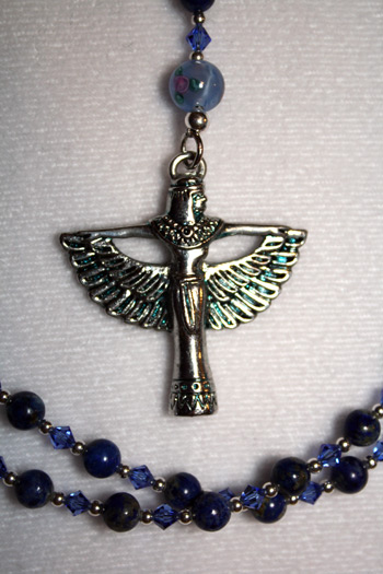 Mother Goddess of the Egyptian pantheon, She exemplifies the utmost in Mother-love, and persistence in tracking down and finding Her lost husband/love, Osiris. To bring the strength and determination of Isis into your life, this is the rosary for you. Made of 6mm Lapis Lazuli gemstones, sapphire-colored Swarovski Crystals with sterling silver spacer beads and blue “floating rose” Czech glass lampwork beads for the “Maters”, this rosary features a harvest-type connecter. The 1 ¾ inch pendant itself is silver-colored pewter accented with light blue enamel on Her spread wings, and a blue crystal at Her throat.