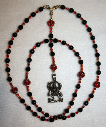 Kali is the Goddess of Destruction so that new can be built, She who rids us of that which no longer serves us in this life. Many people fear Her. However, She is a strong ally in re-ordering your life to get rid of all negative influences and invite the positive to thrive. The Kali rosary is made with 6mm black Onyx beads, separated by red Swarovski crystals and sterling silver spacer beads, with red and black Czech glass lampwork beads for the “Maters”. The connector is a simple 3-armed floral disk, and the 1 ½ inch Kali pendant itself is pewter.