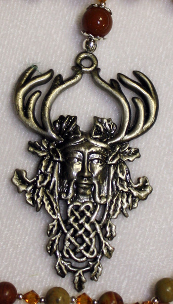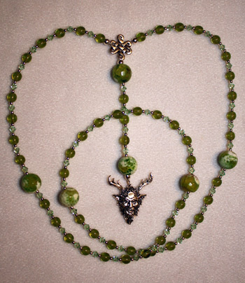 This rosary represents the strength and focus of the God of the Forest and should be used to help focus on the strength inherent within yourself. It is made with 6mm Malachite beads, emerald green Swarovski Crystals and sterling silver spacer beads, with 8mm Malachite “Pater” beads embraced with sterling silver bead caps and a connector depicting the forest flora. The 1 ¼ inch pendant is sterling silver.
