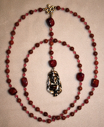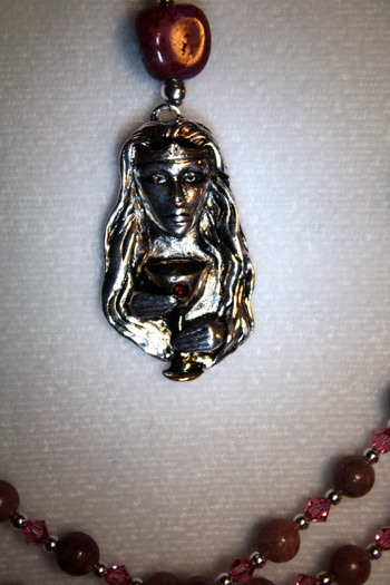 Not truly a “Goddess,” the Chalice Seeker represents the spirit within us which is always searching for the correct and most healing, spiritual path. It’s made with 6mm Rhodonite beads, separated by rose-colored 4mm Swarovski Crystals and 2mm silver spacer beads. The “Mater” beads are dyed pink agate, and the connector is a Celtic Knot. The heavy 1 ½ inch pendant is pewter with gold-colored stylings and both ruby and clear-colored Swarovski Crystal highlights.