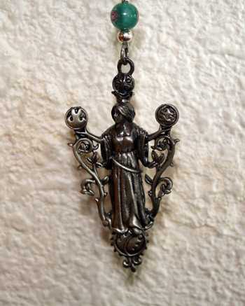 Triple Goddess of the Crossroads, Keeper of the Keys to the Underworld, Torchbearer…. Hecate guides you in all ways. Her paths are often difficult, but promise incredible knowledge and freedom when successfully negotiated. Her service takes discipline, and this rosary can help you focus your attention and your INTENTION. Made of 6mm black Onyx beads, which are sacred to Her, it also contains Jet-colored Swarovski Crystals, and sterling silver spacer beads. The “Mater” beads are Czech glass nuggets. The connector is a Celtic Knot, and the 1 ¾ inch Hecate pendant is gold and silver-colored pewter, features the three faces of the Goddess, and is highlighted with several clear Swarovski crystal insets.