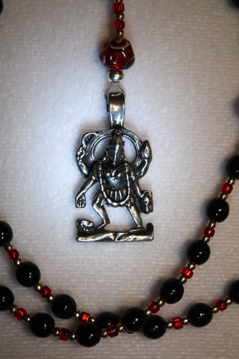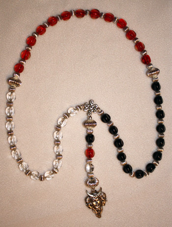 Kali is the Goddess of Destruction so that new can be built, She who rids us of that which no longer serves us in this life. Many people fear Her. However, She is a strong ally in re-ordering your life to get rid of all negative influences and invite the positive to thrive. The Kali rosary is made with 6mm black Onyx beads, separated by red Swarovski crystals and sterling silver spacer beads, with red and black Czech glass lampwork beads for the “Maters”. The connector is a simple 3-armed floral disk, and the 1 ½ inch Kali pendant itself is pewter.