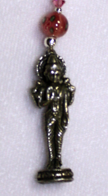 This Indian Goddess of Prosperity and Abundance is a good Goddess to have around when focusing on prosperity and abundance spellwork. This rosary is made out of white 6mm freshwater pearls, rose-colored Swarovski Crystals and sterling silver spacers, and 8mm pink Czech-glass floating-rose lampwork beads for the “Maters”. The connector represents the harvest (abundance), and the pewter pendant is a standing Lakshmi 1 ½ inches tall.