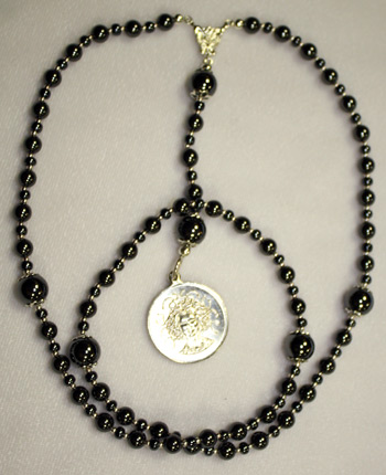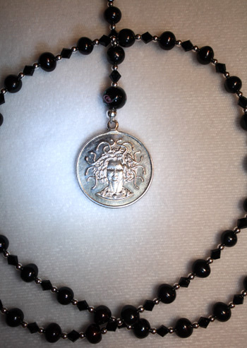 A symbol of women’s rage, Medusa has been reclaimed by feminists everywhere to help direct energy into healing from physical, mental and emotional abuse and incest. Her energy is not to be trifled with, for She takes it very seriously whenever anyone calls upon Her name. She is a Goddess of Protection for all women and children. This rosary is made of 6mm Hematite beads with “hematite” Czech glass and sterling silver spacer beads, 10mm Hematite “Mater” beads with silver bead caps, and a small floral connector. The 1 inch Medusa pendant is a double-sided sterling silver medallion with a beautiful representation of Medusa on the front, and a coil of serpents on the back, to symbolize our ability to shed our skins (and thus our pain and sorrow, hurts and fears, memories and the things which hold us back) in order to become completely new.