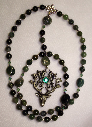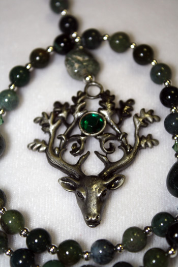 One of our most popular and striking pieces, this guardian of the forest is useful for focusing on the wild things over which you have no control. It is a good way to work with those energies and bring yourself into alignment with them. This rosary is made out of 8mm Moss Agate beads, with green Swarovski Crystal and sterling silver spacer beads, along with larger green Jasper nuggets for the “Pater” beads. The connector is a Celtic Knot, and the 2 ¼ inch pewter Stag’s Head pendant features a large green crystal between the antlers.